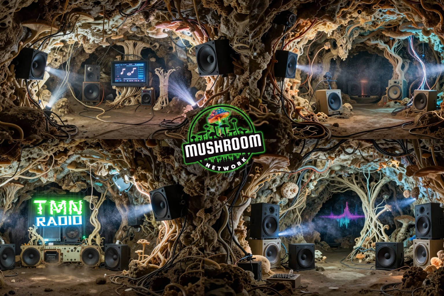 Into fungal studios. Into caplight caverns. Into the deeper layers of TMN-Radio and the vaults of Myco-Verse Productions.