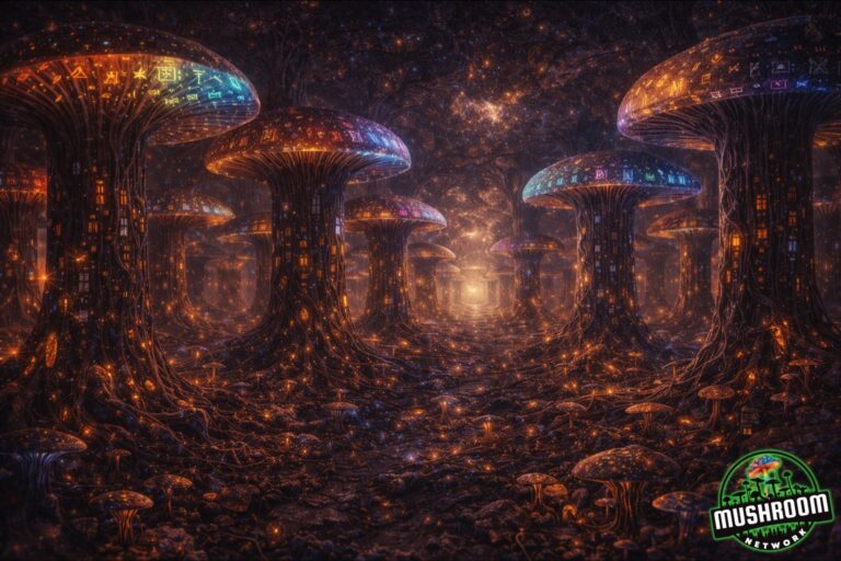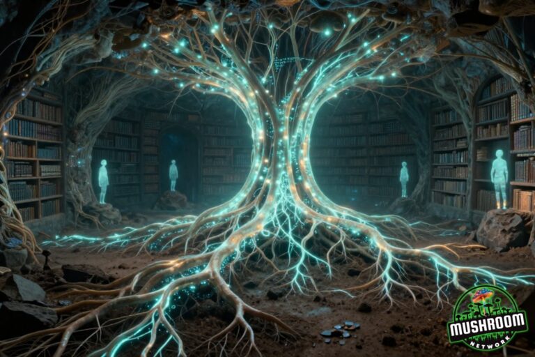 Across the Grand Cosmic Mycelial Network, a theory pulses: that every soulprint, thoughtform, and energetic pattern gets logged—spore by spore—into a multidimensional, non-linear data field built from living fungi. Not metaphorical archives. Actual vibrational repositories stored in the web of mycelium.